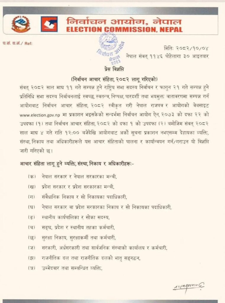 निर्वाचन आयोगले आजै राति १२ बजेदेखि निर्वाचन आचारसंहिता २०८२ लागू गर्ने भएको छ । निर्वाचन आयोगका सहायक प्रवक्ता सीता पुनले भनिन्, ‘आज राति १२ बजेदेखि निर्वाचन आचारसंहिता लागू हुन्छ’