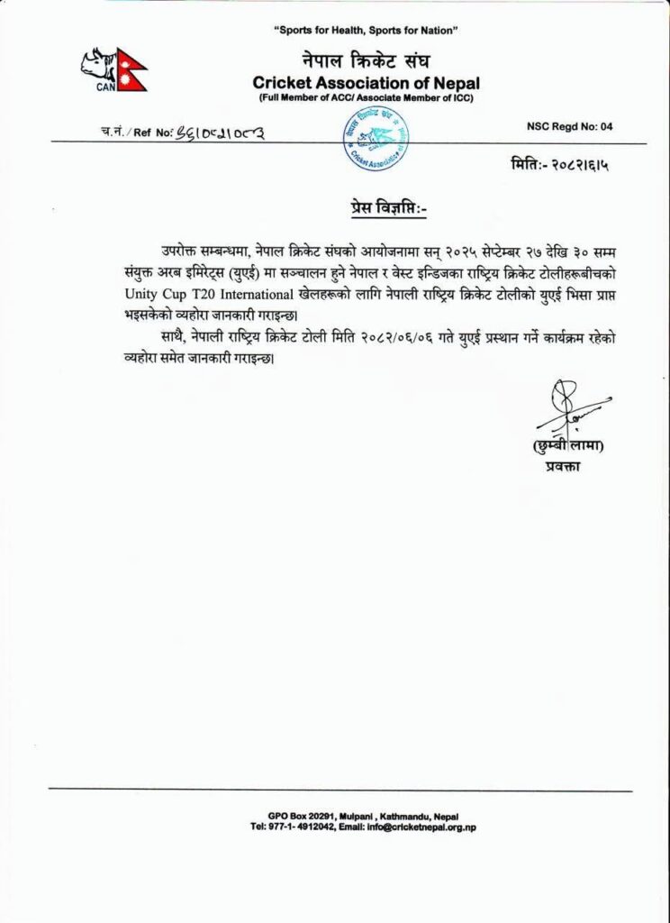 आइतबार क्यानले एक विज्ञप्ति जारी गर्दै भिसा प्राप्त भइसकेको जनाएको छ । नेपाल क्रिकेट संघ (क्यान)का प्रवक्ता छुम्बी लामाले यूएईले नेपाली टोलीलाई भिसा प्रदान गरिसकेको र सोमबार त्यतातर्फ प्रस्थान गर्ने जानकारी दिए ।