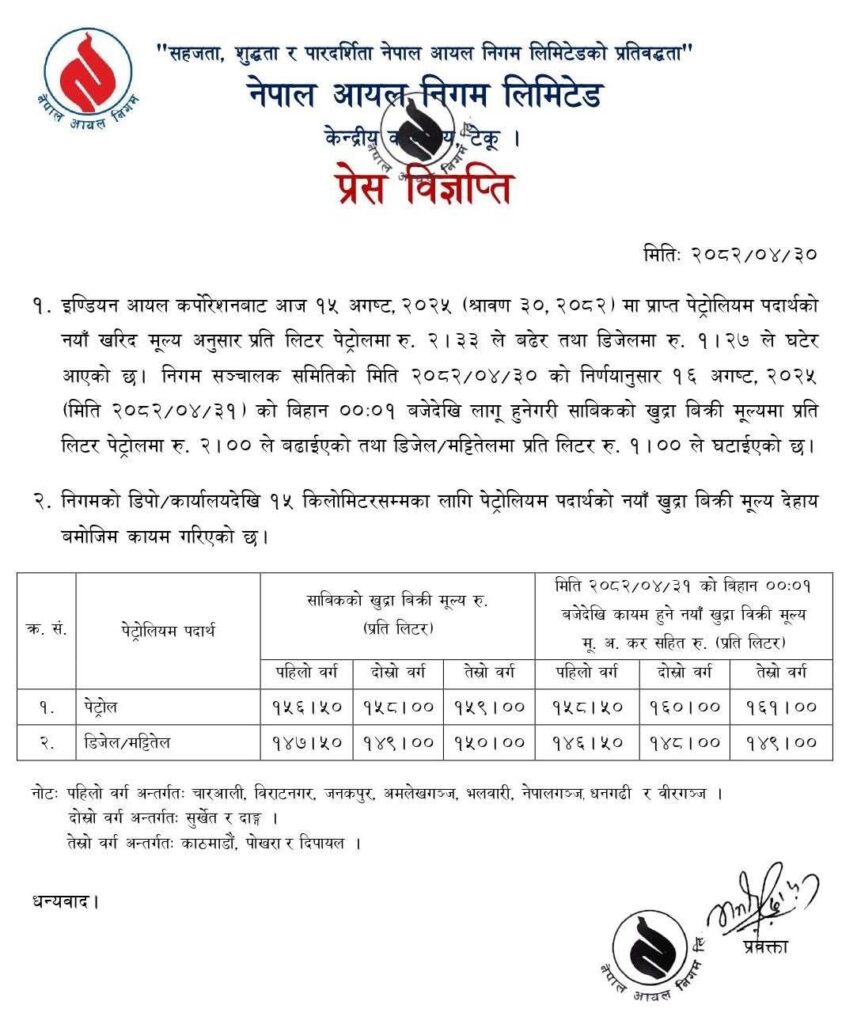 पेट्रोलको मूल्य लिटरमा दुई रुपैयाँ बढाएको र डिजेल र मट्टितेलको मूल्य लिटरमा एक रुपैयाँ घटाएको आयल निगमका कार्यकारी निर्देशक चण्डिका प्रसाद भट्टले जानकारी दिए ।
