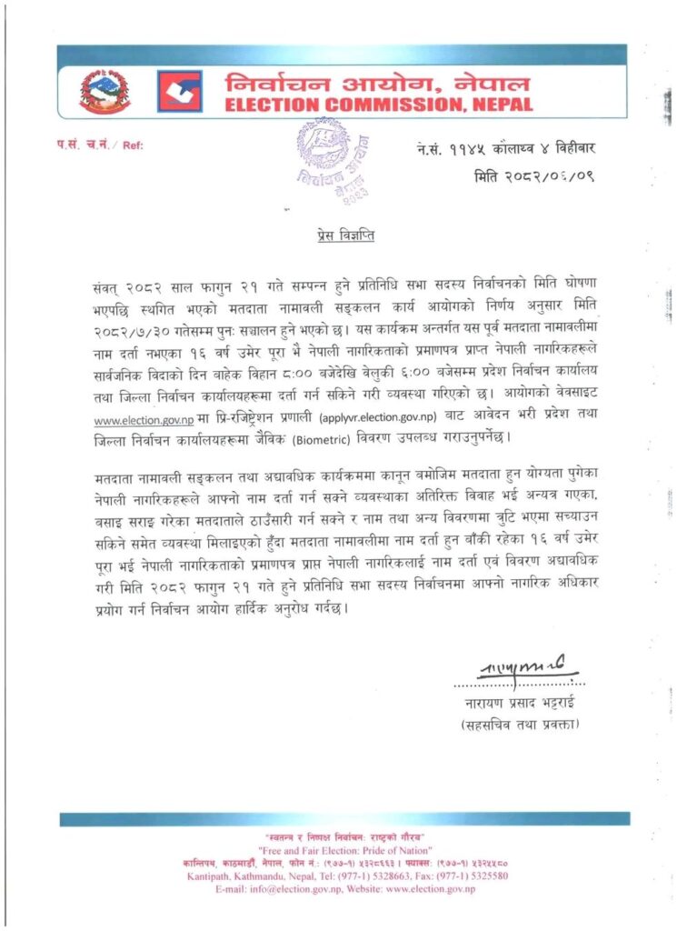 आगामी फागुन २० गतेसम्म १८ वर्ष पूरा हुने नागरिकले भोट हाल्न पाउने आयोगले जानकारी दिएको छ। योसँगै अब मतदान गर्न योग्य युवा र यसअघि छुटेका सबैले नामावलीमा नाम दर्ता गराउन पाउनेछन् ।