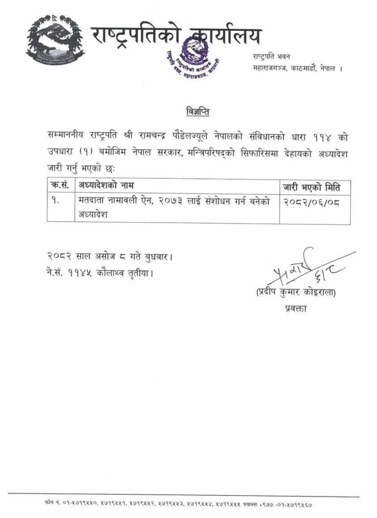 राष्ट्रपति पौडेलले संविधानको धारा ११४को उपधारा १ बमोजिम मन्त्रिपरिषद्को सिफारिसमा मतदाता नामावली ऐन, २०७३ लाई संशोधन गर्न बनेको अध्यादेश जारी गरेका हुन्।