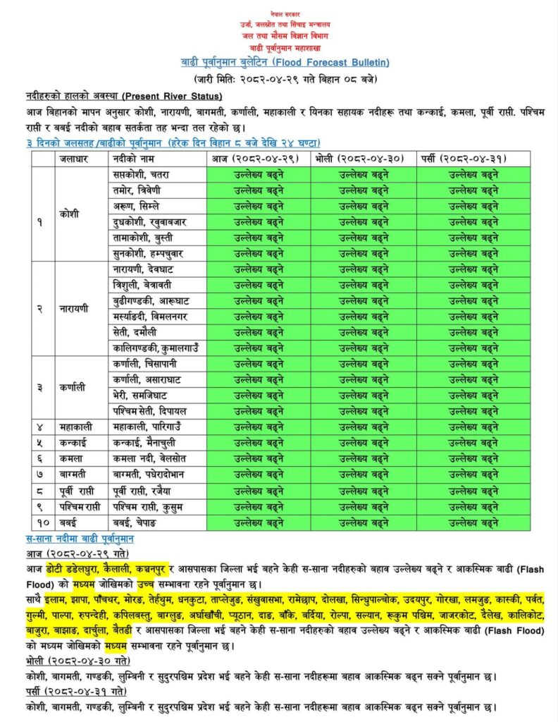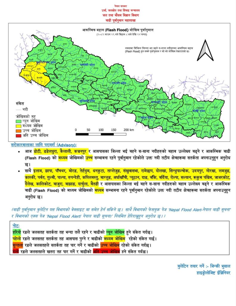 बिहीबार डोटी डडेलधुरा, कैलाली, कञ्चनपुर र आसपासका जिल्ला भई बहने केही स-साना नदीहरूको बहाव उल्लेख्य बढ्ने र आकस्मिक बाढी को मध्यम जोखिमको उच्च सम्भावना रहने पूर्वानुमान छ।