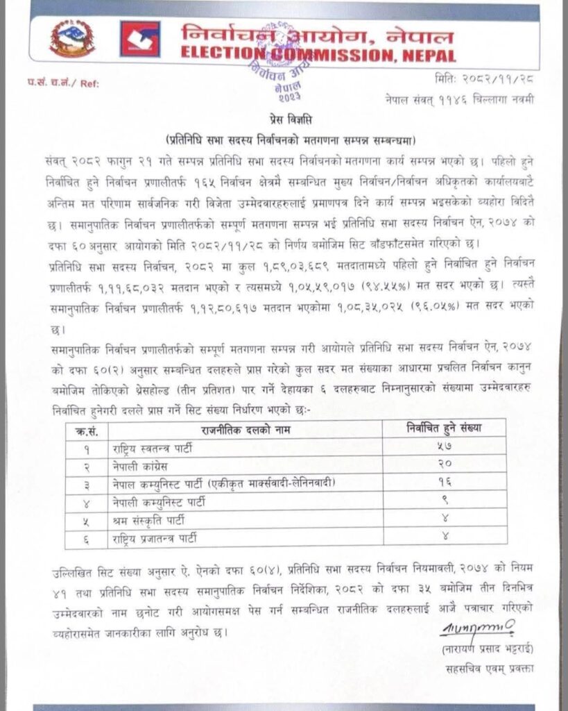 देशभरिबाट समानुपातिक प्रणालीतर्फको दलहरूले पाएको कुल सदर मतमध्ये तीन प्रतिशत मत कटाएका छ वटा राजनीतिक दललाई ११० सीट भाग लगाइएको आयोगका सहसचिव तथा प्रवक्ता नारायणप्रसाद भट्टराईले जानकारी दिए।