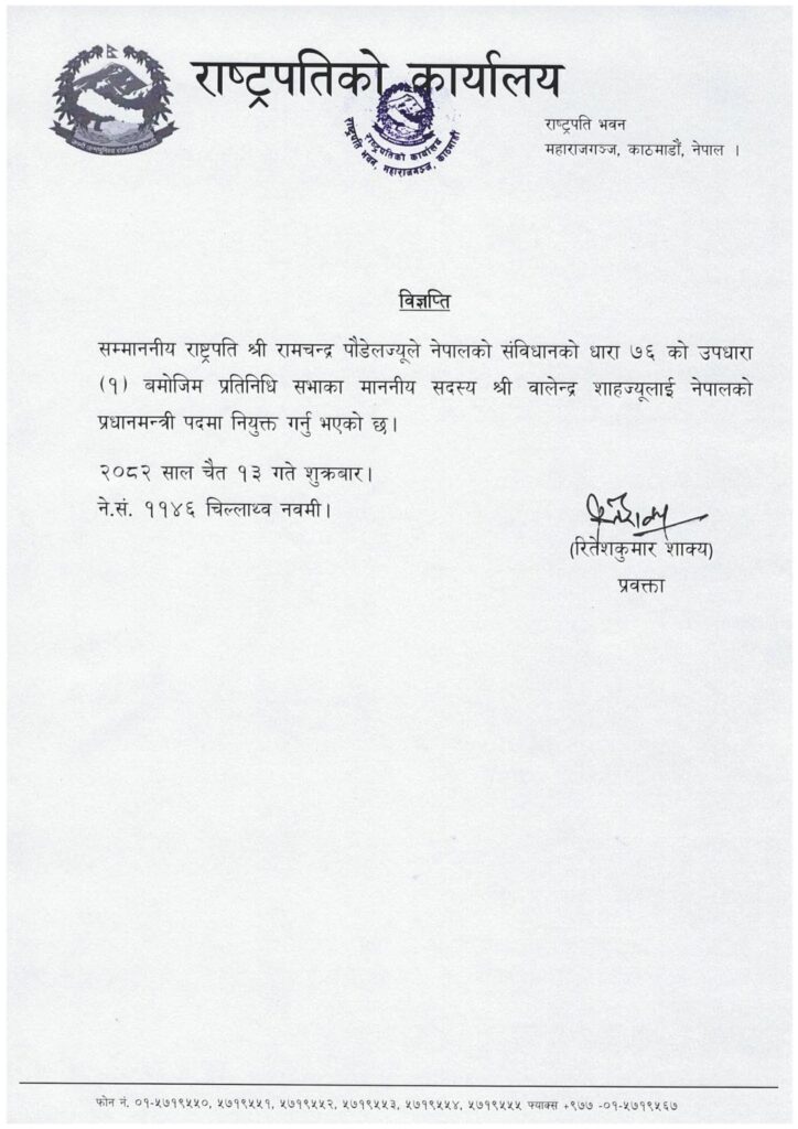 काठमाडौ, चैत १३ । देशको ४३औँ प्रधानमन्त्रीका रूपमा राष्ट्रिय स्वतन्त्र पार्टी (रास्वपा)का वरिष्ठ नेता बालेन्द्र शाह (बालेन) नियुक्त भएका छन् । शुक्रबार (चैत १३) बिहान राष्ट्रपति रामचन्द्र पौडेलले उनलाई प्रधानमन्त्रीमा नियुक्त गरेका हुन् ।